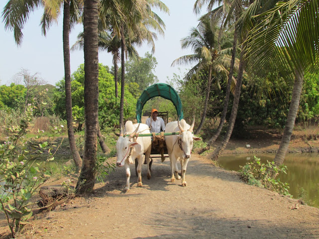 आता मात्र निघायचे वेध लागले होते.सगळे सामान घेऊन गाड्यांमध्ये टाकले.ग्रुप फोटो काढला.अबीरला घेऊन बैलगाडीत बसले.म्हणलं हेच राहिलंय तेवढीही ट्राय करू.दोन मिनिटातच पोरगा जिवाच्या आकांतानी घट्ट मिठी मारून, डोळे मिटून बसला.आमचा जीव सदैव टांगणार्या मुलाला फॉर अ चेंज घाबरलेला पाहुन मजा आली.. दाराशी कार होतीच.. तृप्त मनाने आम्ही पुण्याकडे निघालो..!!