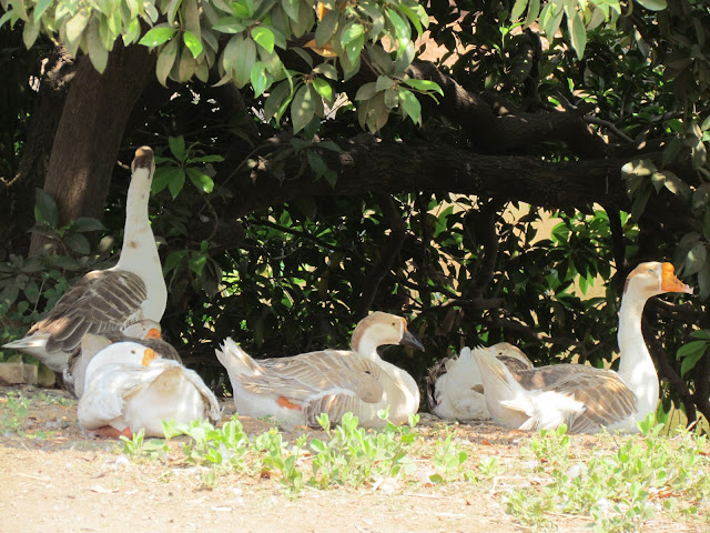 जोरदार भूक लागली होतीच.पण आधी अबीर ची सोय पहायची होती.म्हणून नवर्याला पिटाळले थोडा भात किंवा पोळी मिळते का ते पहायला.५ मिनिटात नवरा माझे + अबीरचे जेवण होईल इतका भात,उकडलेलं कणीस आणि कस्टर्ड घेऊन हजर. म्हणलं "हे रे काय" तर म्हणे "त्यांनी दिलं एवढं..".. हा आणि असे अनेक धक्के मला इथे मिळाले.. कशाच्या बाबतीत मोजून मापून नाहीच.. अबीरसाठी दुध/जेवण काहीही आणि कितीही घेतलं/मागवलं तरी त्यांनी त्याचा हिशोब ठेवला नाही.उ लट बाटल्या उकळून दे.. दुध गरम करून दे अशीही मदत न कुरकुरता केली. जेवणाचा बेतही मस्त होता.पोळी, पालक पनीर, छोले, कस्टर्ड, सॅलड, ताक, वरण-भात आणि उकडलेले कणीस.चवही छान होती. दाबून जेवलो. आता एवढं जेवल्यावर थोडं चालुन येणं भागच होतं. म्हणुन जवळच पाण्यावर शिकारा सोडला आहे तिथे जाऊन बसलो. खरतर आल्यापासुनच नदीचे डोहाळे लागले होते. त्यामुळे घाई गडबडीने लोकं पाण्याकडे निघाले. मला नदीकडून फारशा अपेक्षा नव्हत्याच. कारण आम्ही गाडीतून पाहिलं होतं तेव्हा अगदीच थोडं पाणी दिसलं होतं. त्यामुळे मी फारशी घाई न करता निवांत शेतातून चालत होते.मंडळी मात्र पाण्यात पोहोचली होती..
